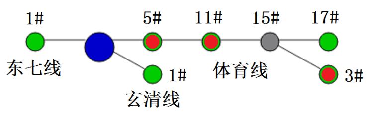在2015-05-29 12:33:40 PS区内经2000欧姆接地试验中,故障线路体育线单相接地故障点之前的故障监测点为:体育线5#杆、11#杆、体育线15#支3#杆,如下图所示,其余为非故障监测点。
